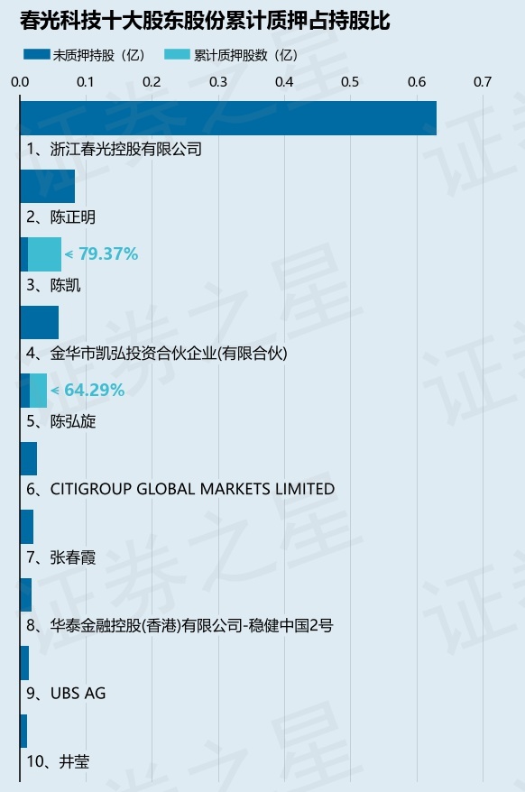 截止本公告日,股东陈凯已累计质押股份500.0万股,占其持股总数的79.37%,股东陈弘旋已累计质押股份270.0万股,占其持股总数的64.29%。本次质押后春光科技十大股东的累计质押股份占持股比例(占持股比例的计算以公司最新一期财务报表公布的十大股东的持股总数为基准)见下图: