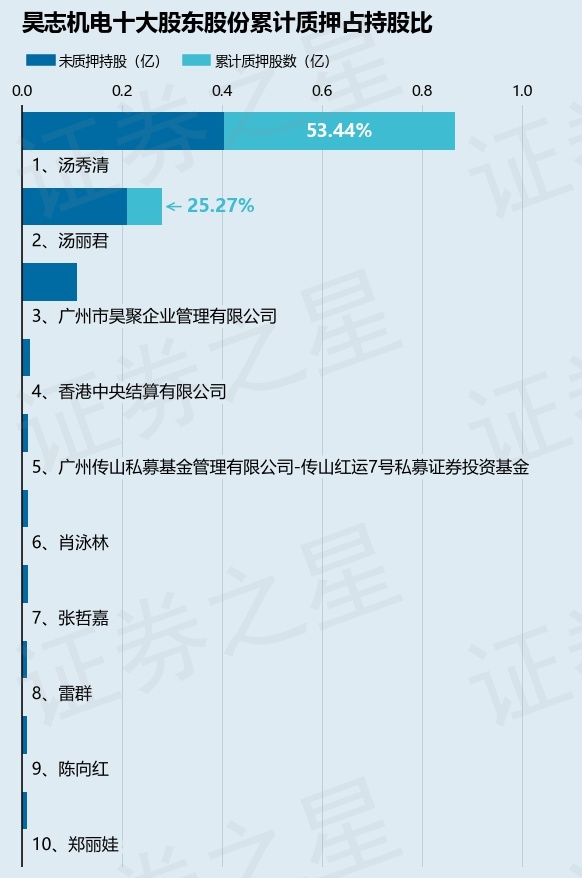 截止本公告日,股东汤秀清已累计质押股份4634.76万股,占其持股总数的53.44%,股东汤丽君已累计质押股份710.5万股,占其持股总数的25.27%。本次质押后昊志机电十大股东的累计质押股份占持股比例(占持股比例的计算以公司最新一期财务报表公布的十大股东的持股总数为基准)见下图: