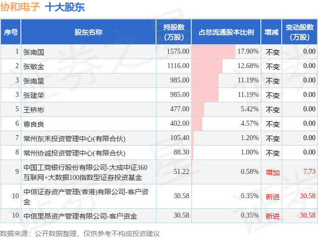证券之星消息,9月26日协和电子发布公告《协和电子:股东减持股份结果公告》,其股东常州东禾投资管理中心(有限合伙)、常州协诚投资管理中心(有限合伙)于2025年7月10日至2025年9月25日间合计减持73.3万股,占公司目前总股本的0.833%,变动期间该股股价上涨6.91%,截止9月25日收盘报34.35元。