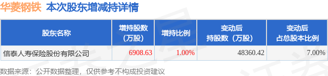 证券之星消息,9月26日华菱钢铁发布公告《华菱钢铁:关于持股5%以上股东增持公司股份触及1%整数倍暨增持股份计划进展的公告》,其股东信泰人寿保险股份有限公司于2025年9月12日至2025年9月26日间合计增持6908.63万股,占公司目前总股本的1.0%,变动期间该股股价上涨4.15%,截止9月26日收盘报6.53元。