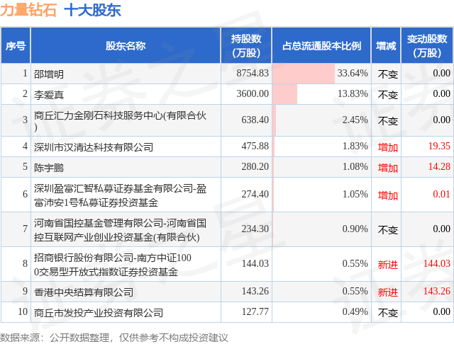 根据力量钻石2025年中报公布的十大股东详情如下: