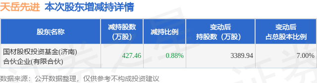 证券之星消息,9月26日天岳先进发布公告《天岳先进:持股5%以上股东减持股份计划公告》,其股东国材股权投资基金(济南)合伙企业(有限合伙)于2025年9月18日至2025年9月26日间合计减持427.46万股,占公司目前总股本的0.882%,变动期间该股股价上涨1.5%,截止9月26日收盘报86.33元。