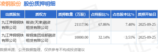 证券之星消息,凌钢股份(600231)9月27日公开信息显示,股东九江萍钢钢铁有限公司向鞍资(天津)融资租赁有限公司、鞍钢集团成都融资租赁有限公司合计质押3.11亿股,占总股本10.91%。质押详情见下表: