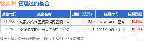 徐森洲先生:中国国籍,上海财经大学经济学学士、硕士。2014年加入交银施罗德基金管理有限公司,历任交易员、权益研究部研究员。2025年01月09日起任交银施罗德多策略回报灵活配置混合型证券投资基金的基金经理。