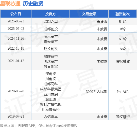 证券之星消息,根据天眼查APP于9月23日公布的信息整理,成都星联芯通科技有限公司B+轮融资,融资额未披露,参与投资的机构包括联想之星。