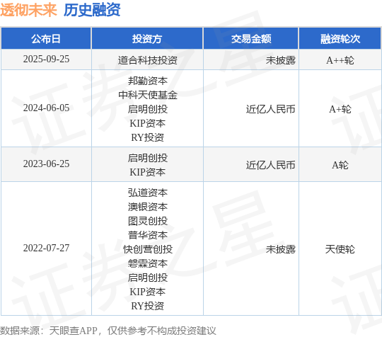 证券之星消息,根据天眼查APP于9月25日公布的信息整理,北京透彻未来科技有限公司A++轮融资,融资额未披露,参与投资的机构包括道合科技投资。