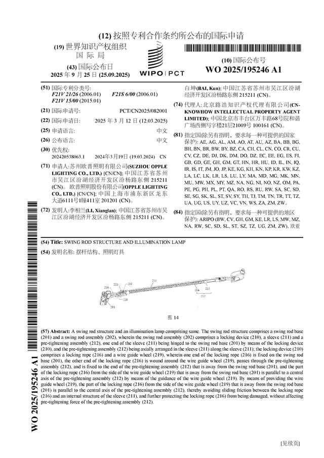 证券之星消息,根据企查查数据显示欧普照明(603515)公布了一项国际专利申请,专利名为“摆杆结构、照明灯具”,专利申请号为PCT/CN2025/082001,国际公布日为2025年9月25日。