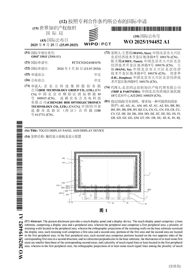 证券之星消息,根据企查查数据显示京东方A(000725)公布了一项国际专利申请,专利名为“触控显示面板及显示装置”,专利申请号为PCT/CN2024/083076,国际公布日为2025年9月25日。