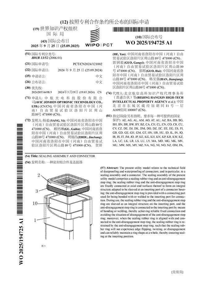 证券之星消息,根据企查查数据显示中航光电(002179)公布了一项国际专利申请,专利名为“一种密封组合件及连接器”,专利申请号为PCT/CN2024/121002,国际公布日为2025年9月25日。