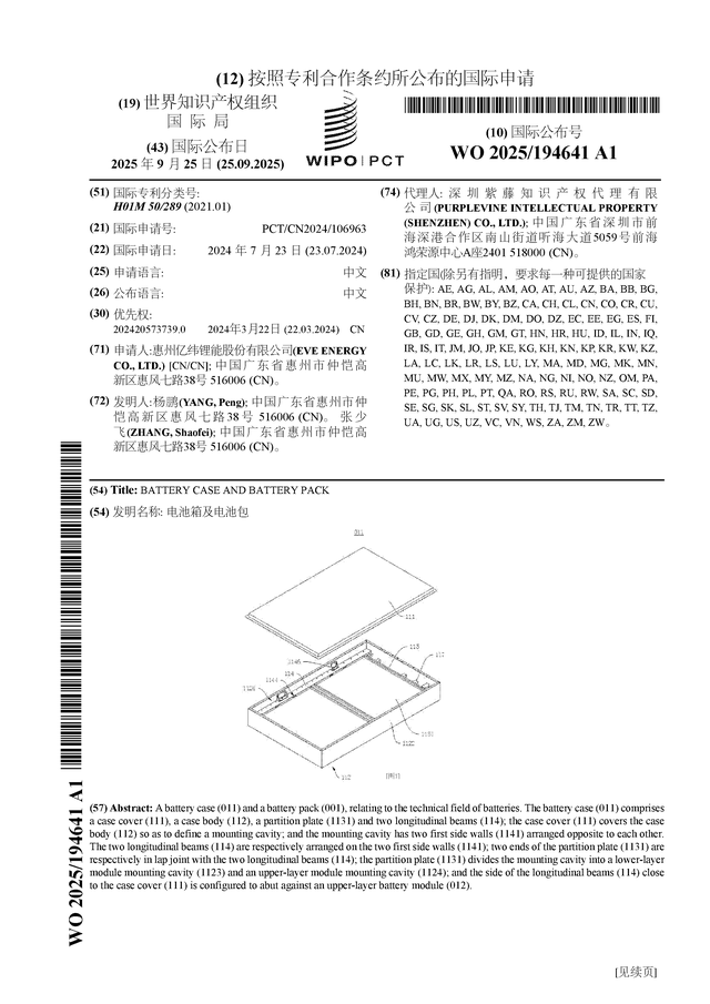 证券之星消息,根据企查查数据显示亿纬锂能(300014)公布了一项国际专利申请,专利名为“电池箱及电池包”,专利申请号为PCT/CN2024/106963,国际公布日为2025年9月25日。