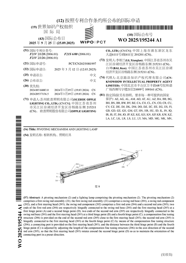 证券之星消息,根据企查查数据显示欧普照明(603515)公布了一项国际专利申请,专利名为“枢转机构、照明灯具”,专利申请号为PCT/CN2025/081997,国际公布日为2025年9月25日。