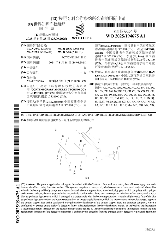 证券之星消息,根据企查查数据显示宁德时代(300750)公布了一项国际专利申请,专利名为“电池蓝膜包覆系统及电池蓝膜包覆的检测方法”,专利申请号为PCT/CN2024/112816,国际公布日为2025年9月25日。