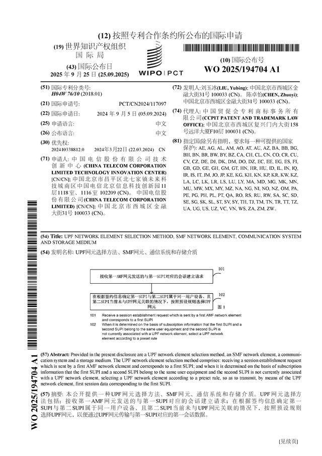 证券之星消息,根据企查查数据显示中国电信(601728)公布了一项国际专利申请,专利名为“UPF网元选择方法、SMF网元、通信系统和存储介质”,专利申请号为PCT/CN2024/117097,国际公布日为2025年9月25日。