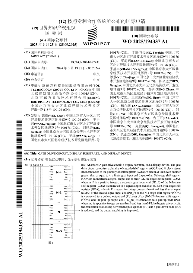 证券之星消息,根据企查查数据显示京东方A(000725)公布了一项国际专利申请,专利名为“栅极驱动电路、显示基板和显示装置”,专利申请号为PCT/CN2024/082431,国际公布日为2025年9月25日。