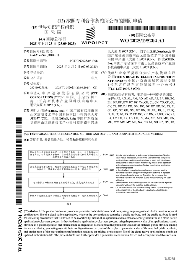 证券之星消息,根据企查查数据显示中兴通讯(000063)公布了一项国际专利申请,专利名为“参数编排方法、设备和计算机可读介质”,专利申请号为PCT/CN2025/081308,国际公布日为2025年9月25日。