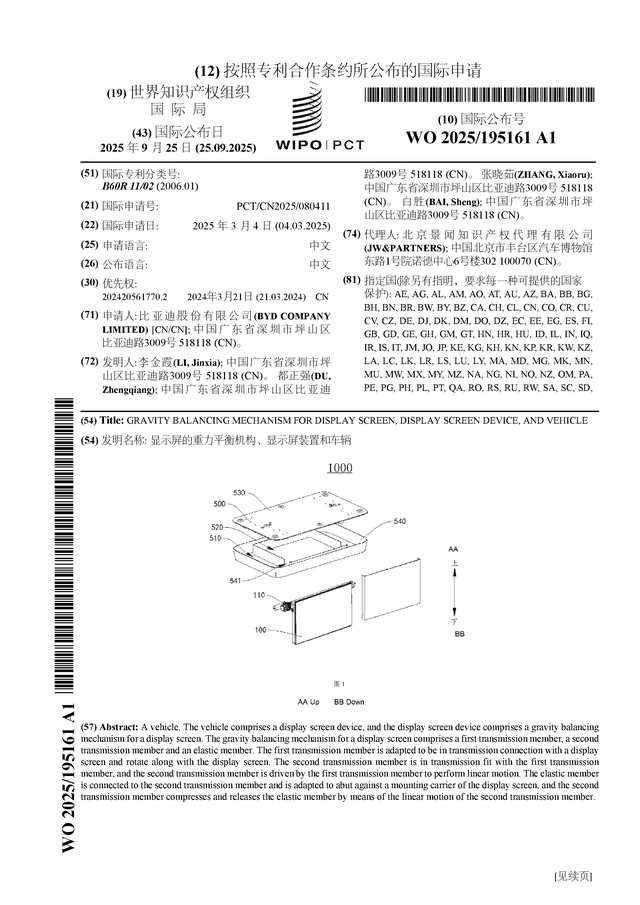 证券之星消息,根据企查查数据显示比亚迪(002594)公布了一项国际专利申请,专利名为“显示屏的重力平衡机构、显示屏装置和车辆”,专利申请号为PCT/CN2025/080411,国际公布日为2025年9月25日。