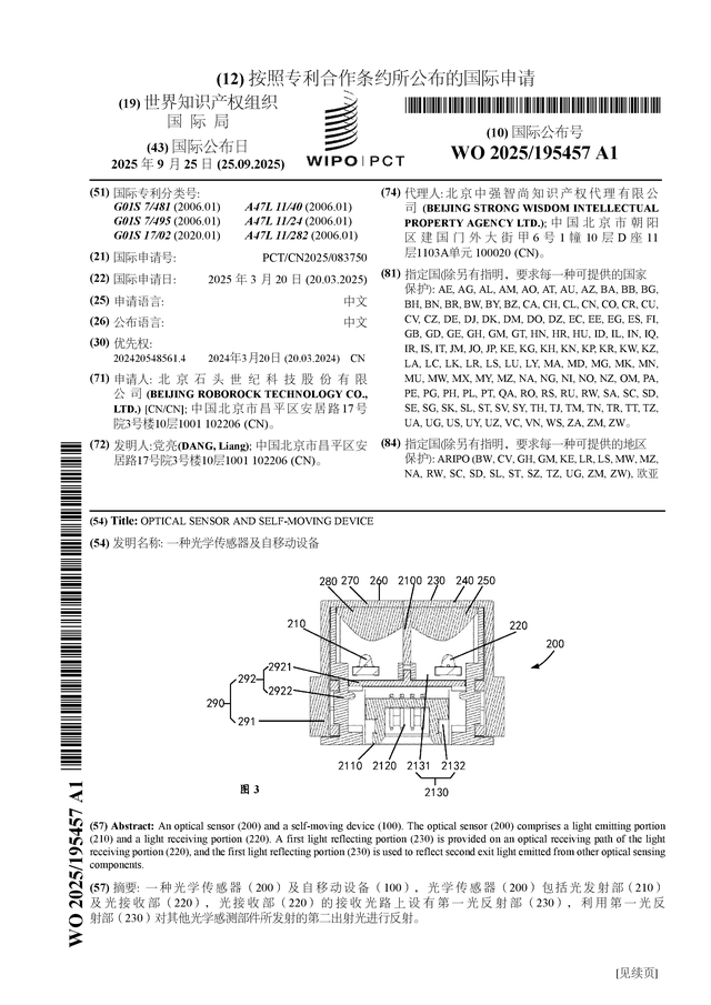 证券之星消息,根据企查查数据显示石头科技(688169)公布了一项国际专利申请,专利名为“一种光学传感器及自移动设备”,专利申请号为PCT/CN2025/083750,国际公布日为2025年9月25日。