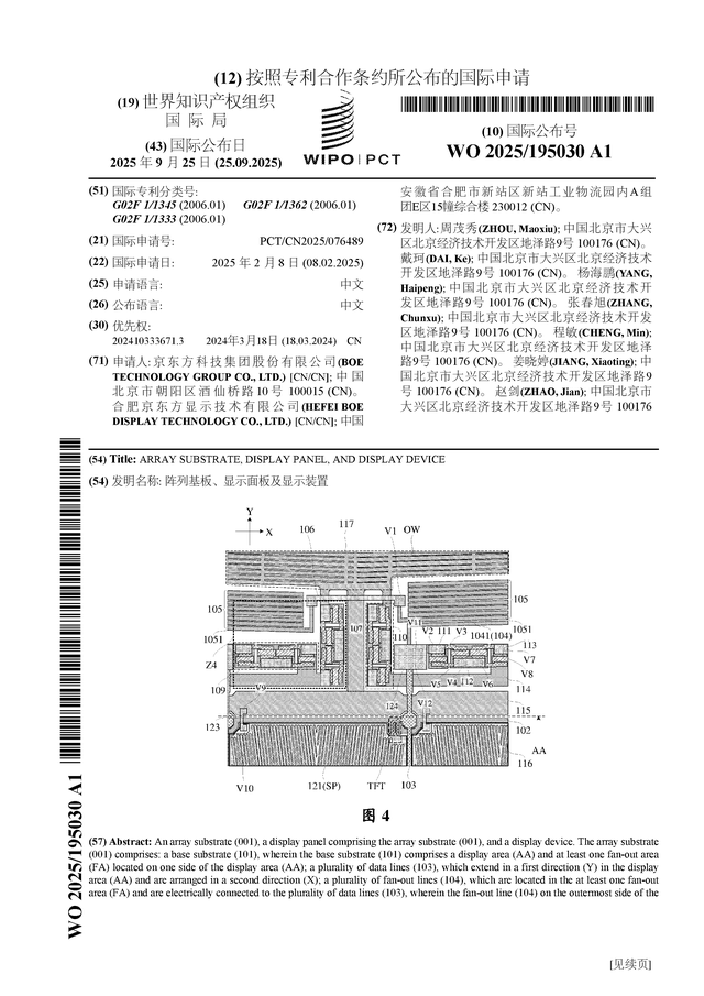 证券之星消息,根据企查查数据显示京东方A(000725)公布了一项国际专利申请,专利名为“阵列基板、显示面板及显示装置”,专利申请号为PCT/CN2025/076489,国际公布日为2025年9月25日。