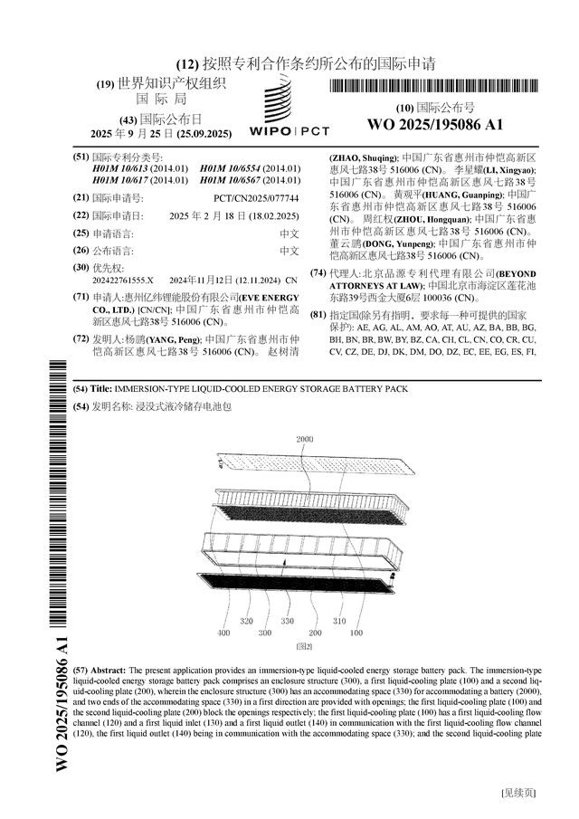 证券之星消息,根据企查查数据显示亿纬锂能(300014)公布了一项国际专利申请,专利名为“浸没式液冷储存电池包”,专利申请号为PCT/CN2025/077744,国际公布日为2025年9月25日。