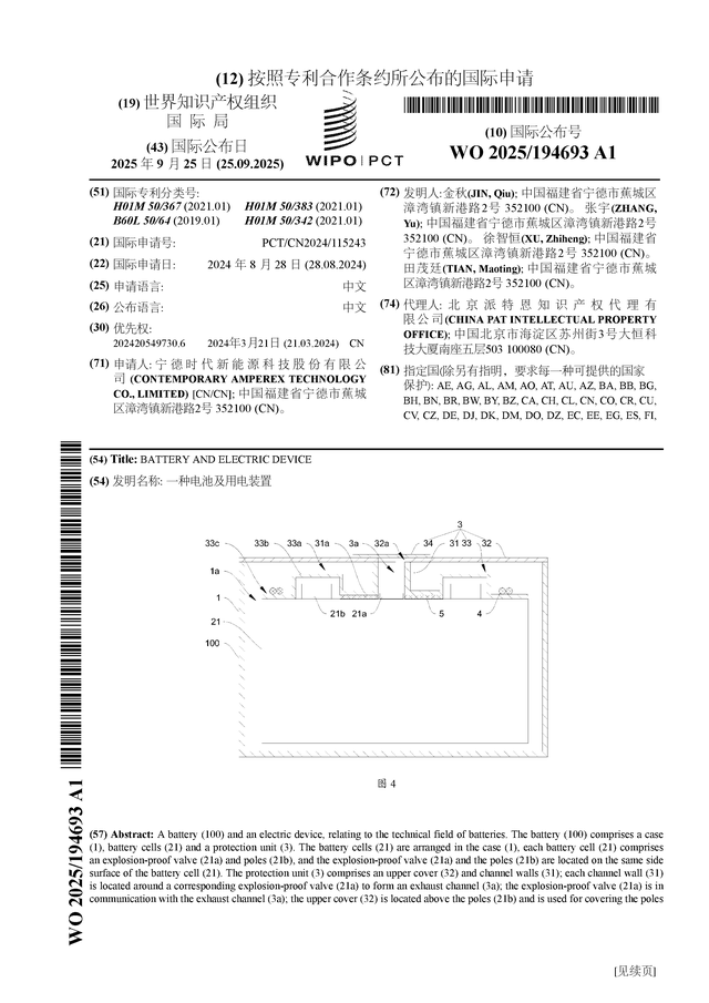 证券之星消息,根据企查查数据显示宁德时代(300750)公布了一项国际专利申请,专利名为“一种电池及用电装置”,专利申请号为PCT/CN2024/115243,国际公布日为2025年9月25日。