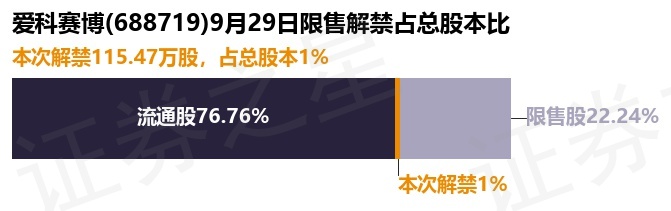 证券之星消息,根据市场公开信息整理,爱科赛博(688719)于9月29日将有115.47万股限售股份解禁,为公司首发战略配售股份,占公司总股本1.0%。(本次数据根据历史公告整理得出,实际情况以上市公司最新公告为准)最近一年内,该股累计解禁6154.1万股,占总股本的53.34%。本次解禁后,公司还有2566.31万股限售股份,占总股本22.24%。具体如下图所示: