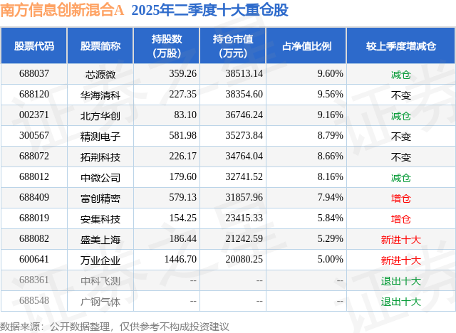 根据2025基金半年报公募基金重仓股数据,重仓该股的公募基金共6家,其中持有数量最多的公募基金为南方基金的南方信息创新混合A。南方信息创新混合A目前规模为24.42亿元,最新净值2.6223(9月26日),较上一交易日下跌0.11%,近一年上涨109.5%。该公募基金现任基金经理为郑晓曦。郑晓曦在任的基金产品包括:南方科创板3年定开混合,管理时间为2024年1月12日至今,期间收益率为82.98%;南方半导体产业股票发起A,管理时间为2024年4月30日至今,期间收益率为98.85%。