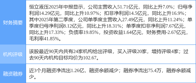 2025年8月26日,国金证券研究员秦亚男,满在朋发布了对恒立液压的研报《业绩符合预期,看好主业复苏和新业务开拓》,该研报对恒立液压给出“买入”评级。研报中预计公司2025-27年归母净利润29/34/41亿元,公司股票现价对应PE估值为39/33/27倍,维持“买入”评级。证券之星数据中心根据近三年发布的研报数据计算,该研报作者对此股的盈利预测准确度为87.73%。