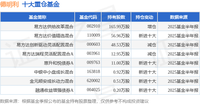 根据2025基金半年报公募基金重仓股数据,重仓该股的公募基金共8家,其中持有数量最多的公募基金为易方达基金的易方达供给改革混合。易方达供给改革混合目前规模为40.56亿元,最新净值3.1164(9月26日),较上一交易日下跌3.2%,近一年上涨35.96%。该公募基金现任基金经理为杨宗昌。杨宗昌在任的基金产品包括:易方达产业机遇混合A,管理时间为2024年8月28日至今,期间收益率为21.04%。