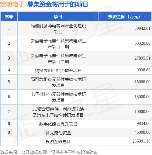 证券之星消息,成都宏明电子股份有限公司(简称:宏明电子)拟在深交所创业板上市,募资总金额为19.51亿元,保荐机构为申万宏源证券承销保荐有限责任公司。募集资金拟用于高储能脉冲电容器产业化建设项目、新型电子元器件及集成电路生产项目一期、新型电子元器件及集成电路生产项目二期、精密零组件能力提升项目、高可靠阻容元器件关键技术研发项目、电子材料与元器件关键技术研发项目、3C精密零组件、新能源电池及汽车电子结构件研发项目、数字化能力提升项目、补充流动资金,详见下表: