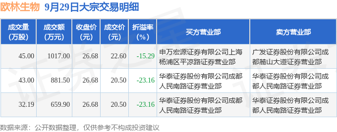 证券之星消息,9月29日欧林生物发生大宗交易,交易数据如下:
