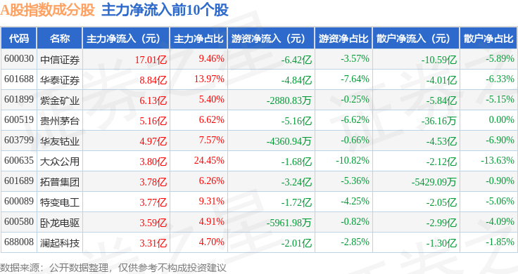 资金流向方面,A股指数(000002)成份股当日主力资金净流出合计14.07亿元,游资资金净流出合计54.4亿元,散户资金净流入合计68.47亿元。成份股资金流向详情见下表: