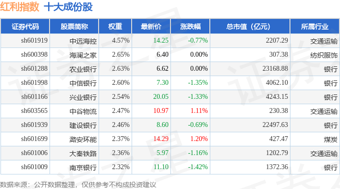 证券之星消息,9月29日,红利指数(000015)报收于2960.96点,跌0.3%,成交312.08亿元,换手率0.31%。当日该指数成份股中,上涨的有19家,南钢股份以2.56%的涨幅领涨,下跌的有28家,平煤股份以3.41%的跌幅领跌。
