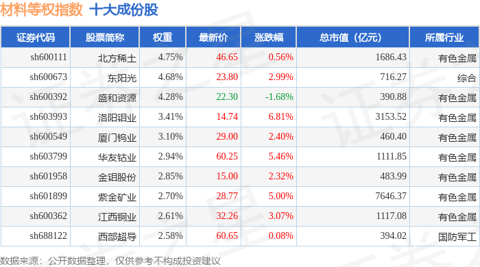 证券之星消息,9月29日,材料等权(000071)指数报收于4249.88点,涨2.51%,成交753.26亿元,换手率1.99%。当日该指数成份股中,上涨的有46家,巨化股份以7.99%的涨幅领涨,下跌的有4家,新凤鸣以3.13%的跌幅领跌。