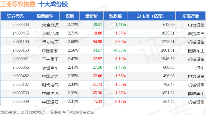 工业等权(000072)指数十大成份股详情如下: