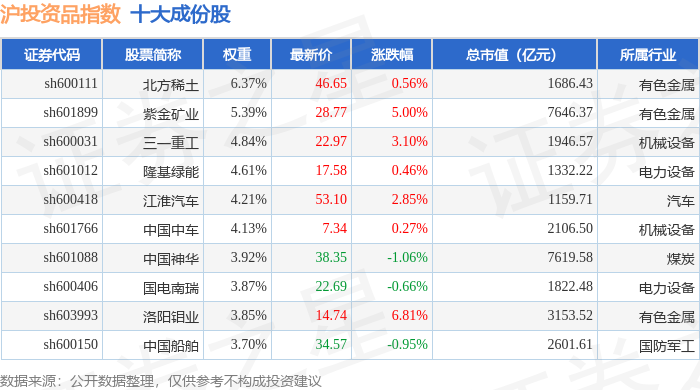 证券之星消息,9月29日,沪投资品(000102)指数报收于6936.21点,涨2.1%,成交879.74亿元,换手率1.66%。当日该指数成份股中,上涨的有39家,中国铝业以6.96%的涨幅领涨,下跌的有9家,淮北矿业以1.69%的跌幅领跌。