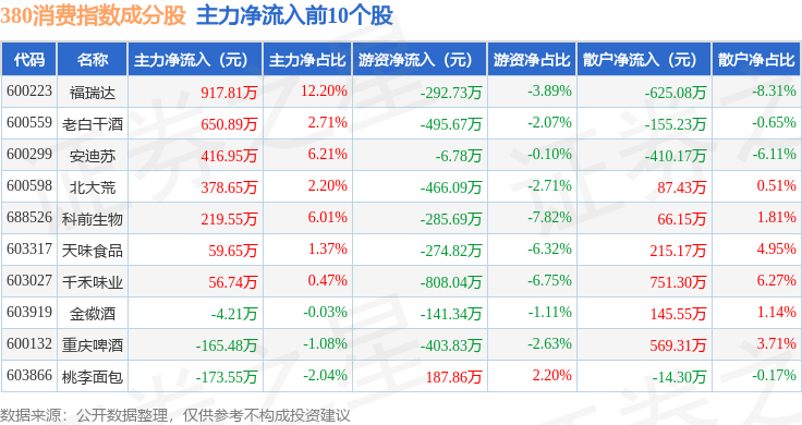 资金流向方面,380消费(000108)指数成份股当日主力资金净流出合计2.55亿元,游资资金净流入合计1.02亿元,散户资金净流入合计1.54亿元。成份股资金流向详情见下表: