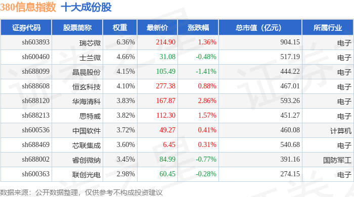 380信息(000111)指数十大成份股详情如下: