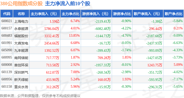 资金流向方面,380公用(000113)指数成份股当日主力资金净流入合计1.98亿元,游资资金净流出合计8519.44万元,散户资金净流出合计1.13亿元。成份股资金流向详情见下表: