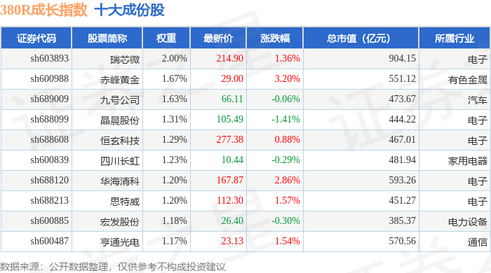380R成长(000119)指数十大成份股详情如下: