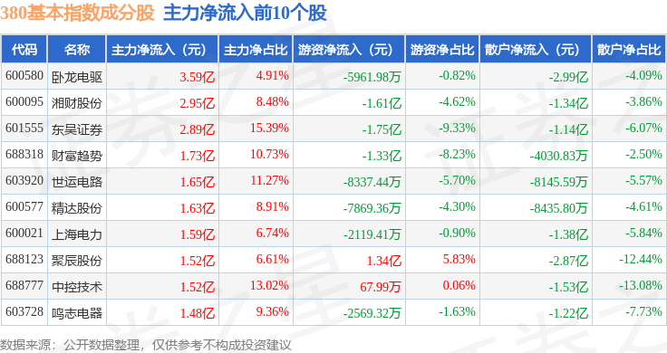 资金流向方面,380基本(000128)指数成份股当日主力资金净流出合计10.1亿元,游资资金净流出合计17.29亿元,散户资金净流入合计27.38亿元。成份股资金流向详情见下表: