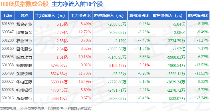 资金流向方面,180低贝(000136)指数成份股当日主力资金净流入合计1.91亿元,游资资金净流出合计3.86亿元,散户资金净流入合计1.94亿元。成份股资金流向详情见下表: