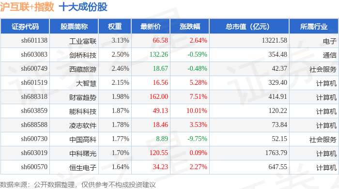 证券之星消息,9月29日,沪互联+(000162)指数报收于3753.01点,涨1.02%,成交714.39亿元,换手率1.38%。当日该指数成份股中,上涨的有46家,能科科技以10.01%的涨幅领涨,下跌的有25家,中国高科以9.75%的跌幅领跌。