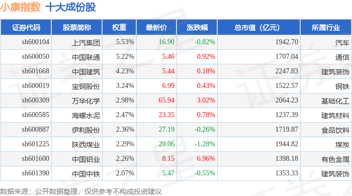 小康指数(000901)十大成份股详情如下: