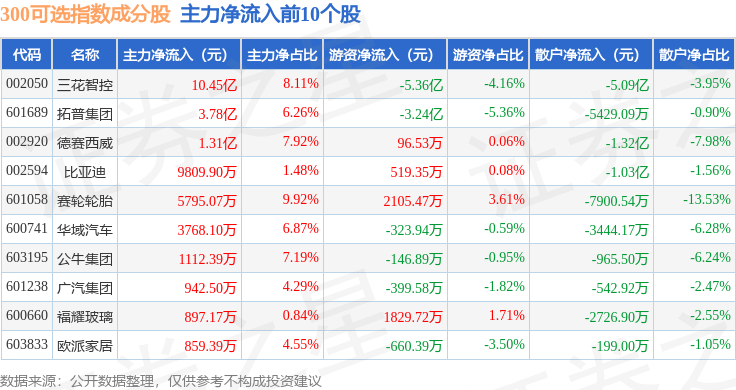 资金流向方面,300可选(000911)指数成份股当日主力资金净流入合计4.61亿元,游资资金净流出合计2.87亿元,散户资金净流出合计1.74亿元。成份股资金流向详情见下表: