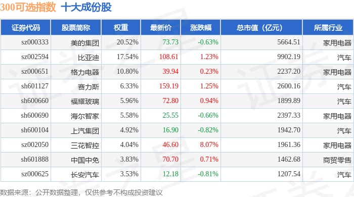 证券之星消息,9月29日,300可选(000911)指数报收于6756.48点,涨0.99%,成交511.17亿元,换手率1.23%。当日该指数成份股中,上涨的有14家,三花智控以8.07%的涨幅领涨,下跌的有7家,上汽集团以0.82%的跌幅领跌。