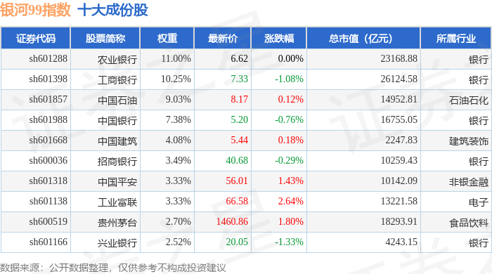证券之星消息,9月29日,银河99(000959)指数报收于7688.33点,涨0.58%,成交3903.25亿元,换手率0.6%。当日该指数成份股中,上涨的有66家,华泰证券以10.01%的涨幅领涨,下跌的有28家,浦发银行以1.55%的跌幅领跌。