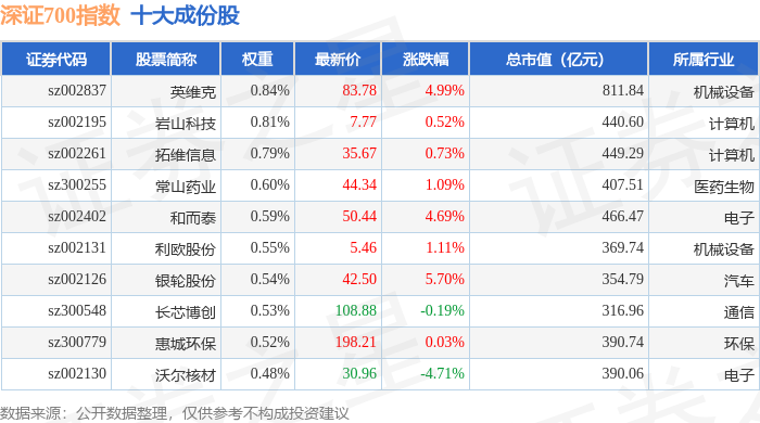 深证700(399010)指数十大成份股详情如下: