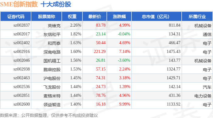 证券之星消息,9月29日,SME创新(399017)指数报收于4989.42点,涨1.68%,成交1641.08亿元,换手率3.78%。当日该指数成份股中,上涨的有75家,科达利以10.0%的涨幅领涨,下跌的有23家,沃尔核材以4.71%的跌幅领跌。