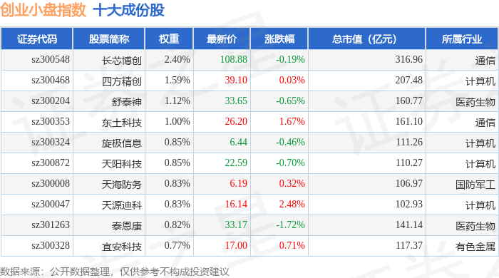 证券之星消息,9月29日,创业小盘(399020)指数报收于1750.85点,涨1.07%,成交763.5亿元,换手率3.7%。当日该指数成份股中,上涨的有204家,初灵信息以20.0%的涨幅领涨,下跌的有87家,菲菱科思以5.68%的跌幅领跌。