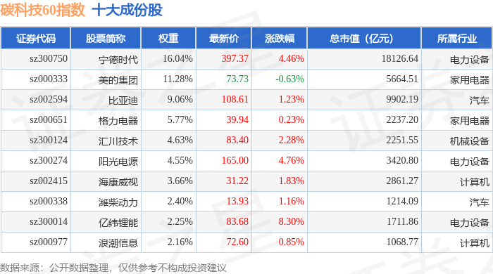 碳科技60(399060)指数十大成份股详情如下: